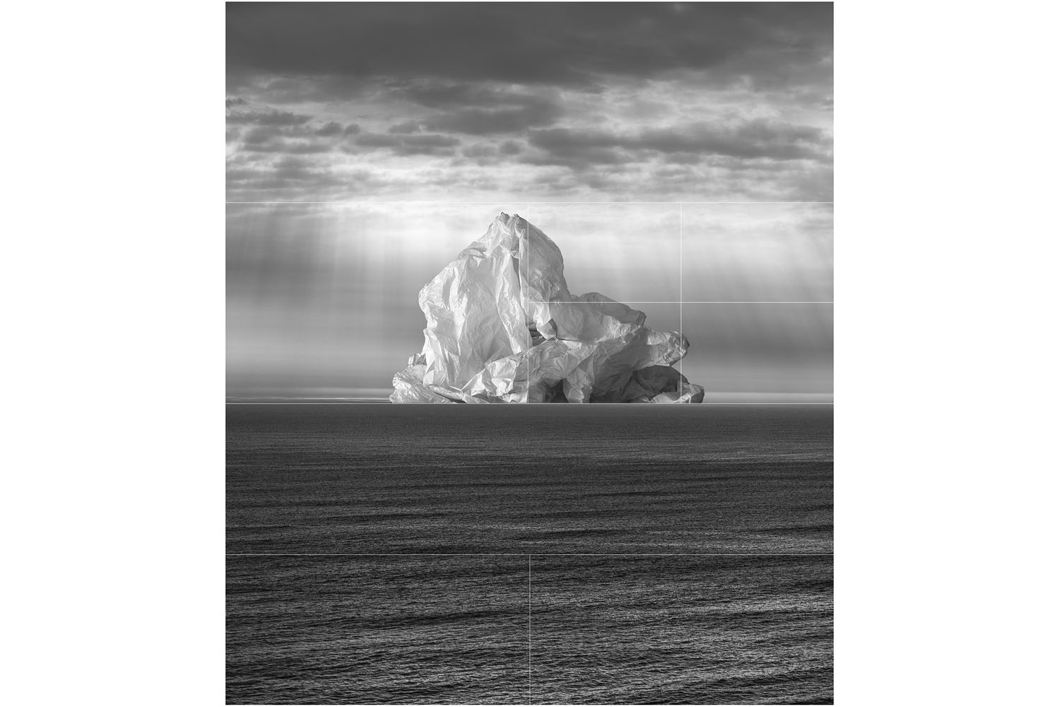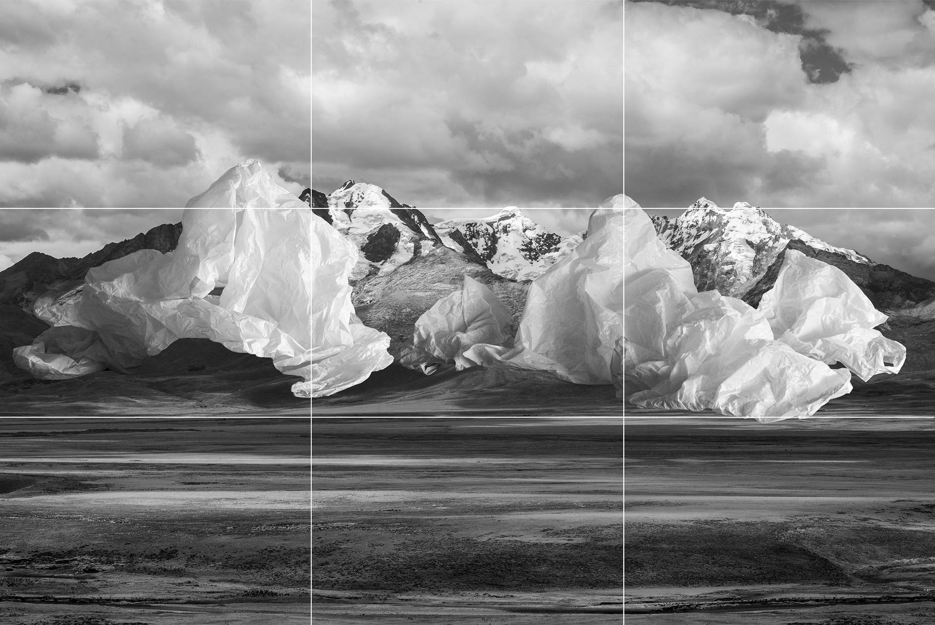 Las formas de las sombras y arrugas de plástico aparentan ser los pliegues de un enorme iceberg. La geometrización de la imagen, las líneas que la intervienen como alejándola aún más de la realidad, muestran no sólo su naturaleza cultural sino también geométrica. Como sucede en el arte de la representación, tanto la naturaleza como la abstracción geométrica aparecen sólo a través de signos y lenguajes culturales. La naturaleza, el territorio como metáfora de espacio y de vida.