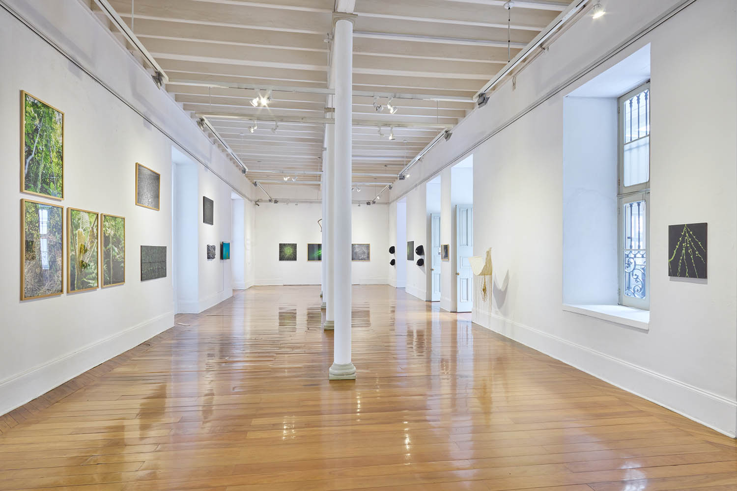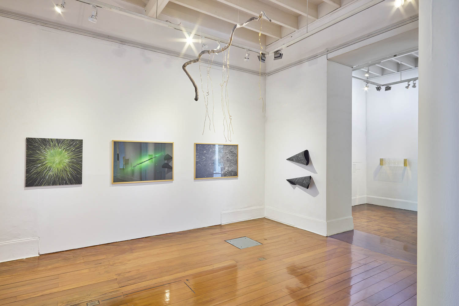 El arco visual que delinea Lorena Noblecilla en esta exposición es decididamente más amplio y abarcador que su reflexión acerca de la naturaleza en su individual anterior, titulada “Lección de Historia Natural”, en 2023. Ahí donde buena parte de su interés estaba potentemente puesto en la materia, ahora lo está en la energía, sobre todo en la lumínica. La propuesta está visualmente signada por el verde como color, que prima tanto por el lado de la pintura fluorescente que la artista usa puntualmente en un reducido número de obras pictóricas, como en una visión del bosque amazónico en su fotografía, testimonio patente de un reino de la clorofila, que fija la luz y la convierte en alimento, y con ello está al origen de la configuración de la cadena alimentaria.